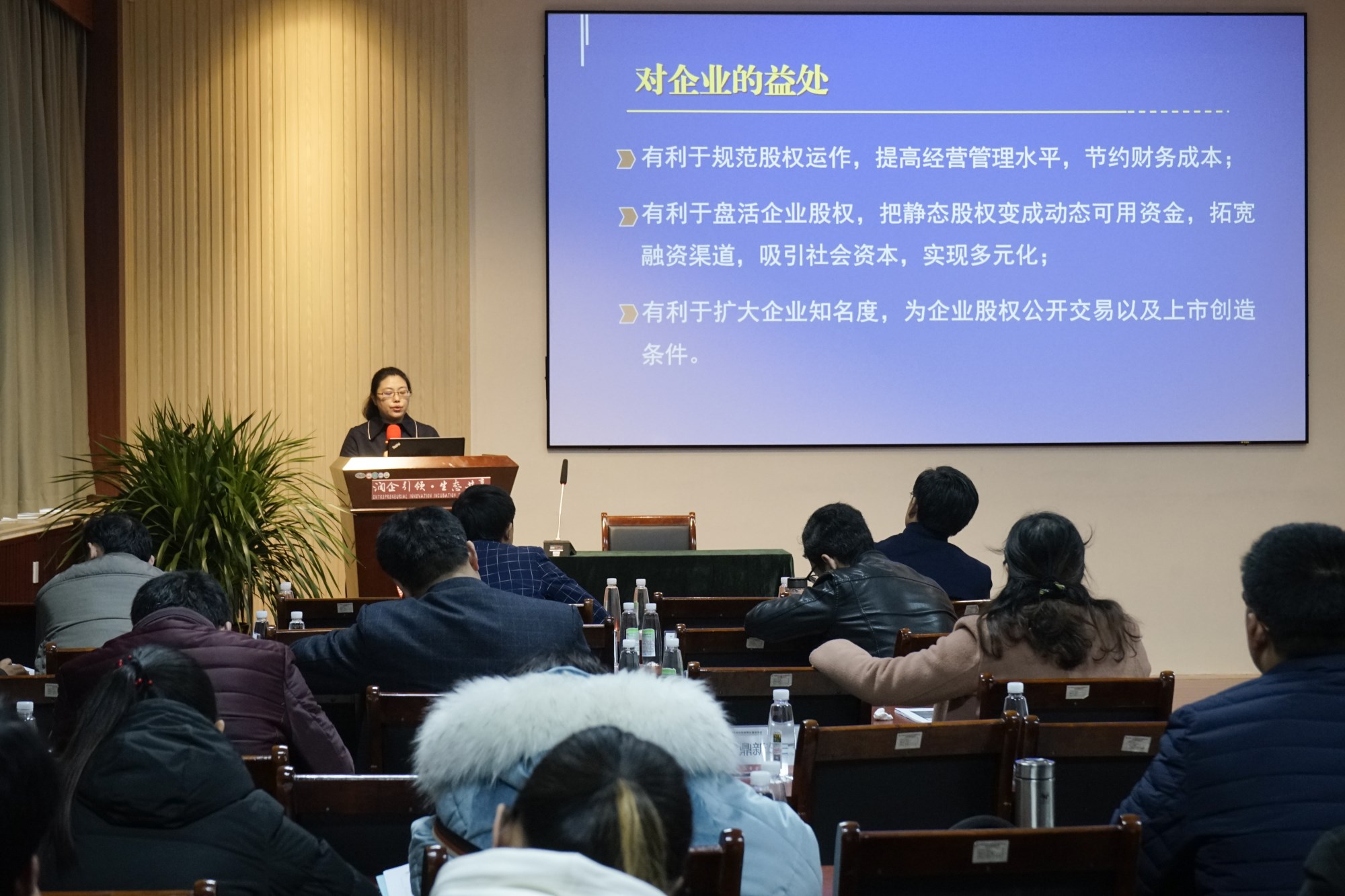 2018年12月8日,日照市创业创新孵化服务中心举办2018(第11期) “聚力发展大讲堂”培训班,蓝产权受邀作“股权质押融资方略”培训讲座。各区县经信局、民经办相关领导以及各区县重点企业负责人等近100人参加了此次会议。会上,股权托管部王寒娟部长就股权登记托管与股权质押融资业务为与会企业做了详细介绍。